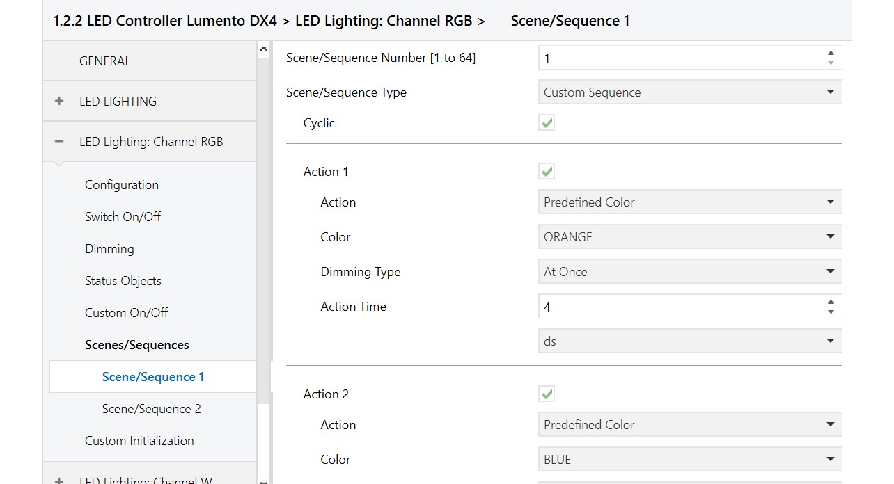 Ik heb de zennio Lumento genomen en via een scene is het gelukt om elke kleur om beurt een aantal ds (decisecondes blijkbaar :D ) te laten aangaan. dus dat was perfect.