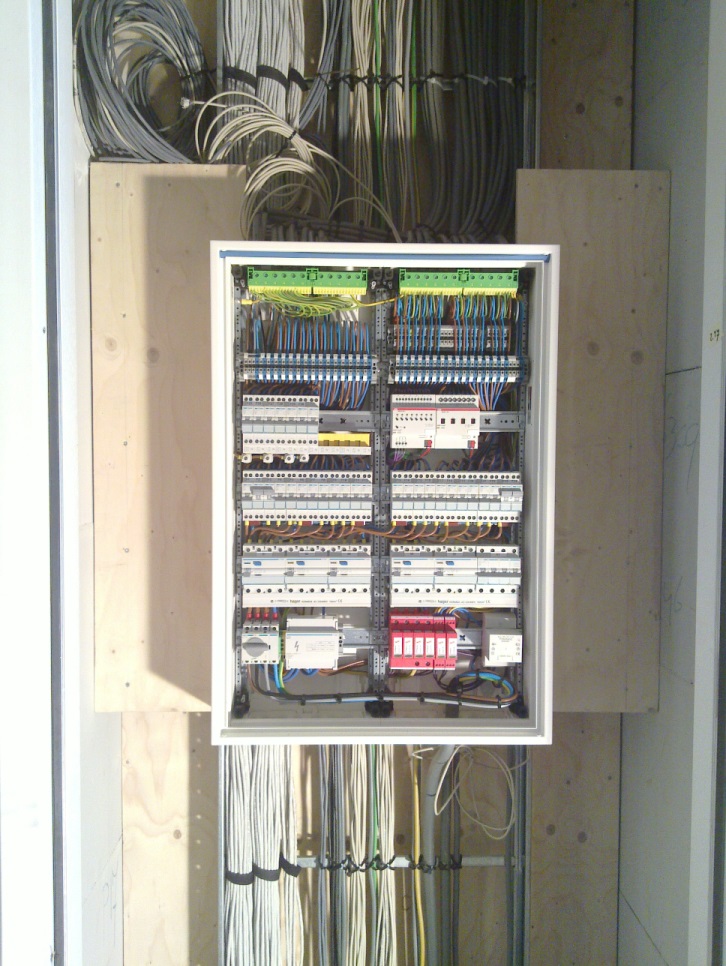 Nochtans kan men door het gebruik van horizontale goten tussen de din-rails en verticale goten aan de zijkanten van de din-rails alles mooi geleiden en eenvoudig toegankelijk houden. De foto hieronder zou dat moeten illustreren. De kabelgoten worden tenslotte met een plaat die er over klikt toegemaakt.