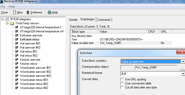 Nu heb ik in Experte gevonden hoe ik IP telegrammen kan configureren (verzenden/ontvangen), zie bijgevoegde afbeelding. Dit stukje gaat denk ik wel lukken.